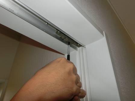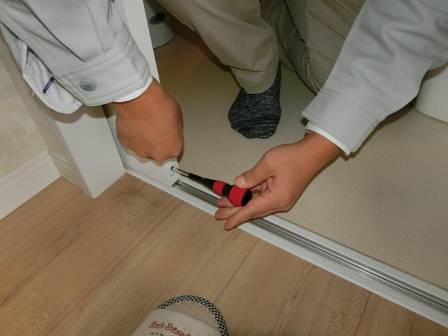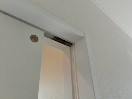現状を確認。開閉テストの結果、上のレールに取り付けられているソフトクローズが効かなくなっているのを発見。ドライバーでソフトクローズのビス位置や引き戸の側面ネジを調整して、正常に機能するように補正しました。