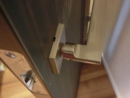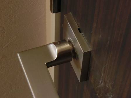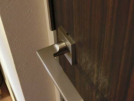 【ドアノブの緩み】2013年12月21日(土)お家の点検2年目(中新川郡立山町S邸) 2014.02.28 開き戸のノブが緩んでいるのを発見。 [DK] 永原がドライバーを手に持ってノブの根元のビスを増し締めして現状を改善。点検スタッフの横窪をサポートしています。