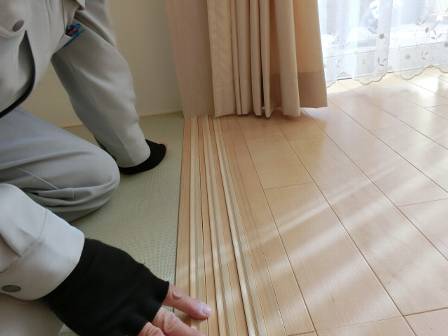 【レールの浮き】2013年11月30日(土)お家の点検1年目(高岡市S邸) 2014.02.27 Q レールが浮いている。 [和室] 現状を確認。何かの拍子(子供さんのお遊び?)に少し出ているレールに引っ掛かるのでしょうか。少し浮いている(剥がれている)状態でした。 そこで強力接着剤で再接着して現状を改善。