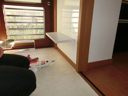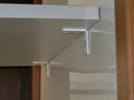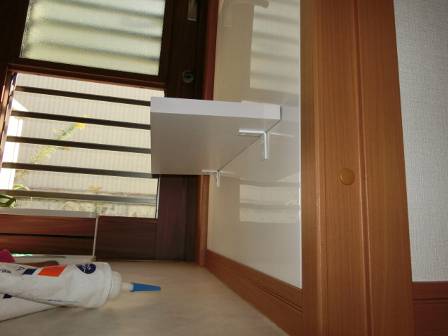 支えている金物を確認。今回の事例とは規模が違いますが、別の点検現場で「テレビカウンターの前かがみ・前下がり」という現象がありました。これはカウンターや上に乗っているテレビの重みでカウンターの先端部分が下がる事例です。当時は壁面だけの支え・固定だと見栄えはステキだと思っていましたが、現実的には難しい施工であると痛感させられました。何らかの対応をすることをお約束。