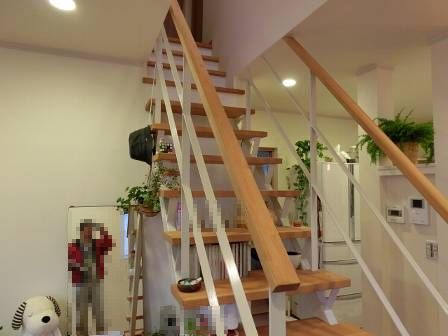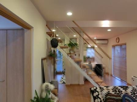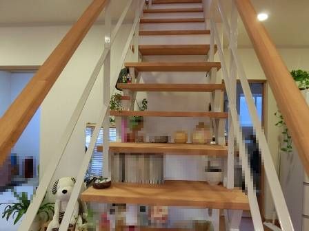 スケルトン階段。踏み桁を少し奥に伸ばして小物が置けるように工夫されています。