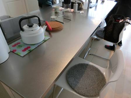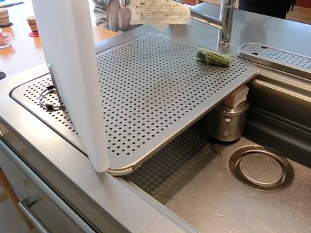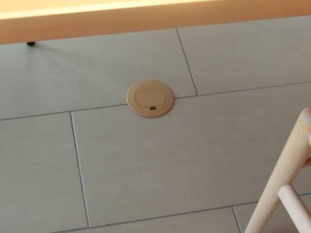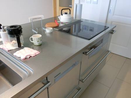 このタイプのステンレスキッチンはカウンター一体型であり、コンセントを取り付ける場所がありません。ピット型のコンセントでミキサー等の電源を確保しています。