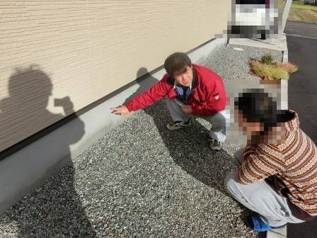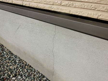 【基礎の化粧モルタルのヒビ割れ】2013年11月26日(火)お家の点検2年目(高岡市J邸) 2014.02.27 基礎の化粧モルタル施工にヒビ割れを2ヶ所発見。構造上はほとんど問題ないことを説明し、補修跡が目立つ事例もあるので、お客様と協議の結果、現在のままで良いことになりました。 [建物左面/南側の玄関寄り] [建物左面/南側の後面寄り]