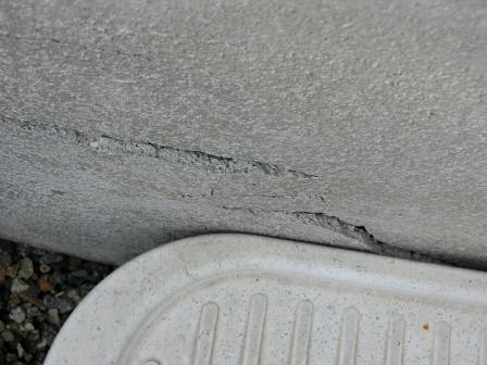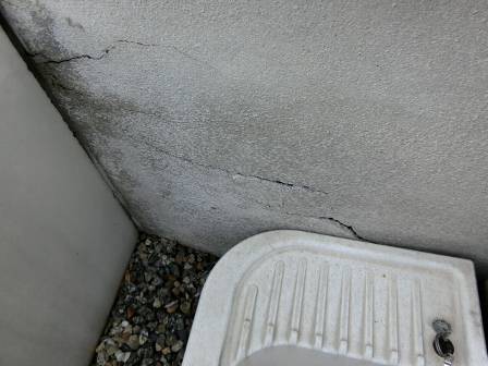 現状を確認。立水栓の左右にはテラス(左)と雑土間(右)があります。テラスの自重で少し沈んだことによって表層施工の化粧モルタルも巻き込まれたものと思われます。構造的な基礎本体にまでは影響は及んでないのですが、見た目が気になります。後日この部分をやり直し施工することをお約束。
