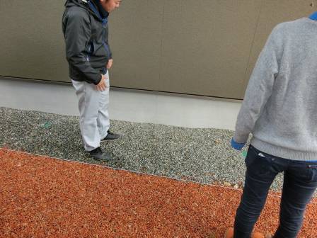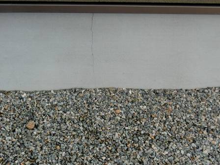 【基礎化粧モルタルのヒビ割れ】2015年2月20日(金)お家の点検1年目(魚津市M邸) 2016.02.18 基礎化粧モルタルのヒビ割れが数箇所ありました。基礎の表面に施してある薄い化粧用のモルタルのヒビ割れだと思われるので構造上は特に問題ありません。お客様と協議の結果、ヒビ割れの部分が拡張(ヒビに雨水が進入し凍結すると体積が約1.1倍)しないようにモルタルを詰めることをお約束。 [建物右面/西側]