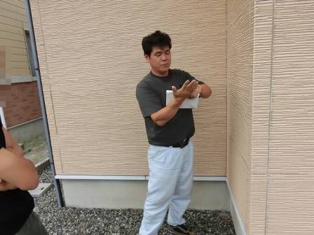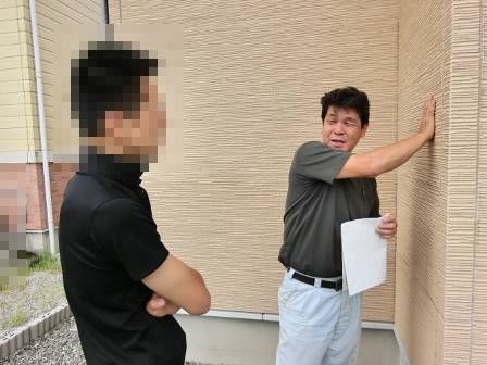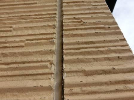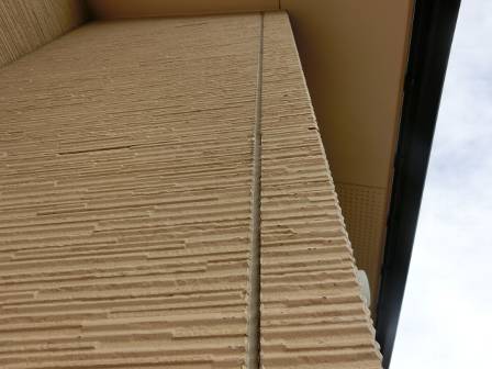 【塗装の剥がれ】2014年8月11日(月)お家の点検10年目(富山市Y邸) 2015.03.07 外壁塗装の経年劣化について。防水塗膜は太陽の紫外線等によって次第に劣化してきます。外壁を手で撫でると塗装が劣化して粉化している状態(チョーキング現象)が再塗装の目安となります。そのまま放置しておくと基材が傷んでくる事例もありますので、事前のご相談も承っております。 [建物後面/南側] 細かいようですが、外壁材の凹凸仕様の先端部分が経年変化等によって少しずつ剥げてきている様子が分かります。現段階では特に異常はありません。