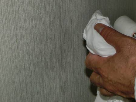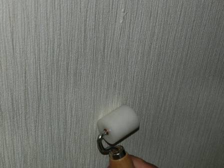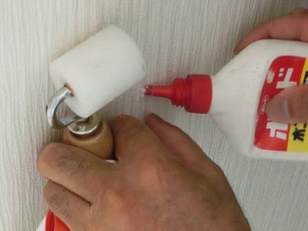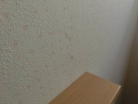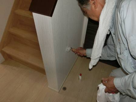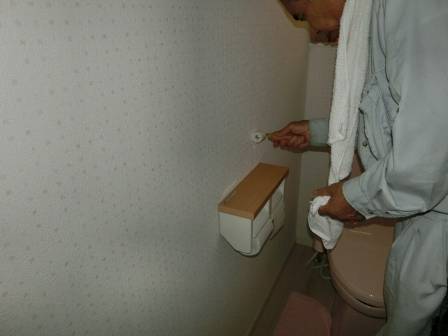 【壁クロスがめくれた】2016年7月2日(土)お家の点検5年目(富山市水橋O邸) 2017.03.03 クロスがめくれてきた。トイレのクロスは自分でくっ付けてみた(お客様からの事前葉書) [1階ホール/トイレ前] [1階トイレ/紙巻き器の上] 現状を確認。ボンド剤で目立たないように補修することになりました。 [ボンド剤を充填] [ローラーで均す] [ローラー均しの後はタオルで拭き取り]
