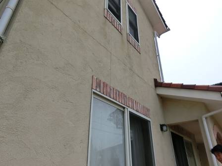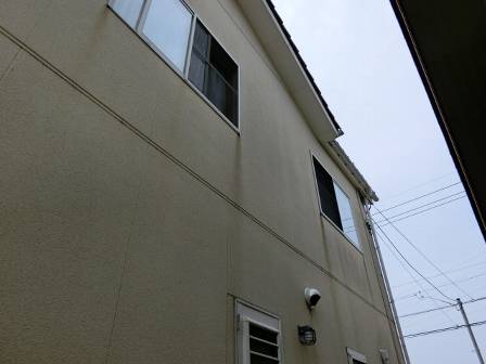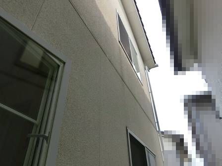 【外壁のヒビ割れ・動き】2014年6月21日(土)お家の点検10年目(砺波市M邸) 2015.03.06 外壁材のジョイント部分の上に施されている塗り壁に数箇所のヒビ割れが発生していました。 [建物正面/南側] 建物の左右の面は隣家が接近して直射日光(紫外線)が当たりにくい環境。そのせいかヒビ割れ現象はほとんど見受けられませんでした。 [建物右面/東側] [建物左面/西側]