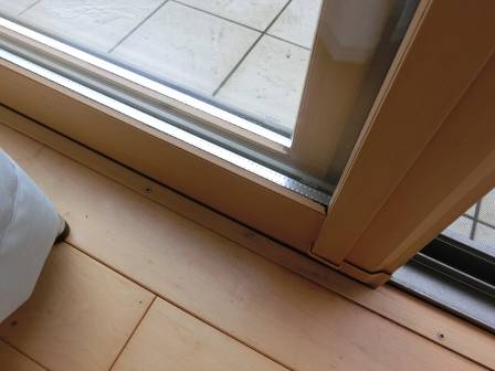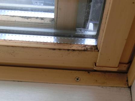 結露跡を調査。LDKは日頃のお手入れで拭き掃除がなされていますが、2階居室のお子様の部屋は出入りが厳しくてなかなかご両親の注意が行き届かないようです。ゴム枠部分には小さなカビが発生していました。