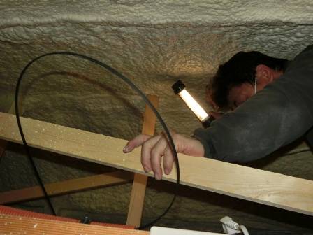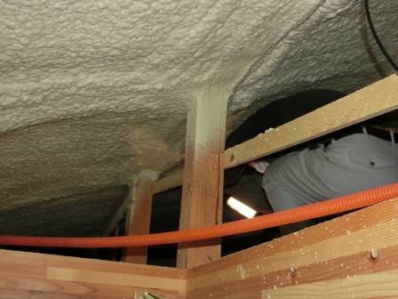 【小屋裏点検】2014年11月8日(土)お家の点検2年目(高岡市O邸) 2015.06.03 小屋裏点検を実施。 屋根材の裏地には吹き付け断熱が施されています。雨漏り跡は分かりにくいのですが、断熱材のヒビ割れ等は見受けられませんでした。