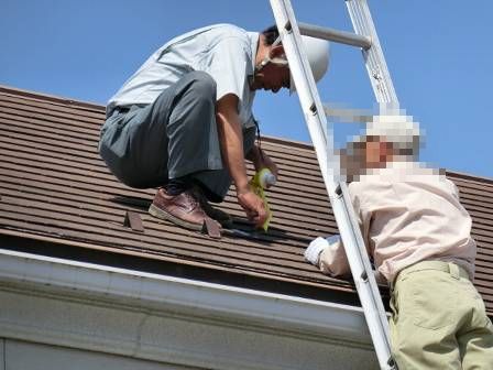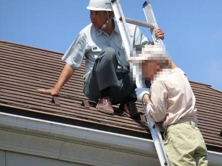 屋根点検を実施。お客様も屋根の状態を気にかけておられたご様子。点検スタッフの後から長ハシゴをのぼってこられました。