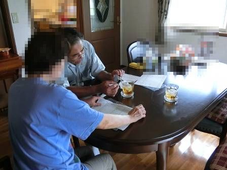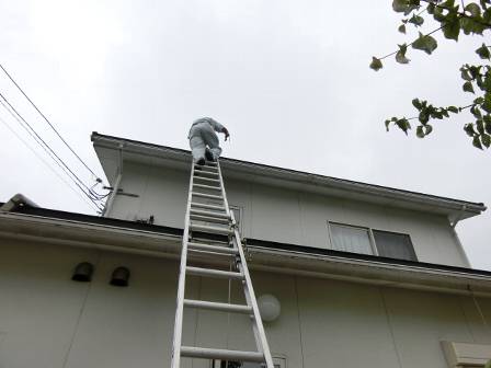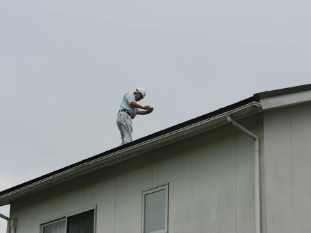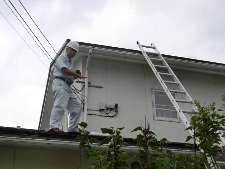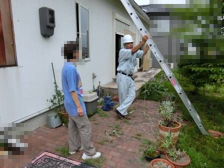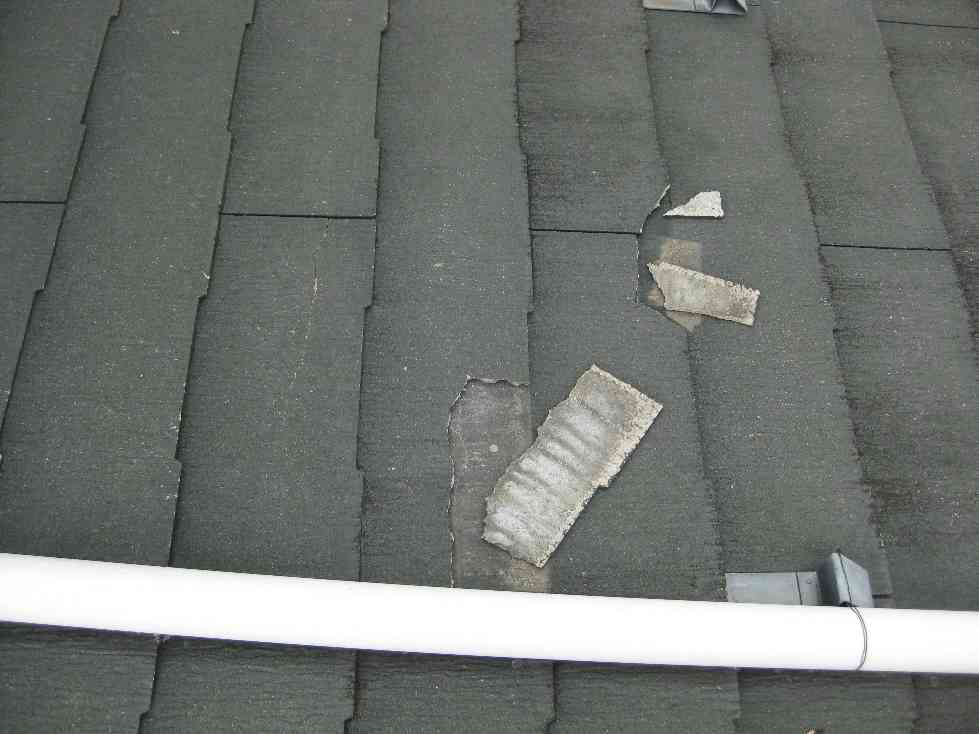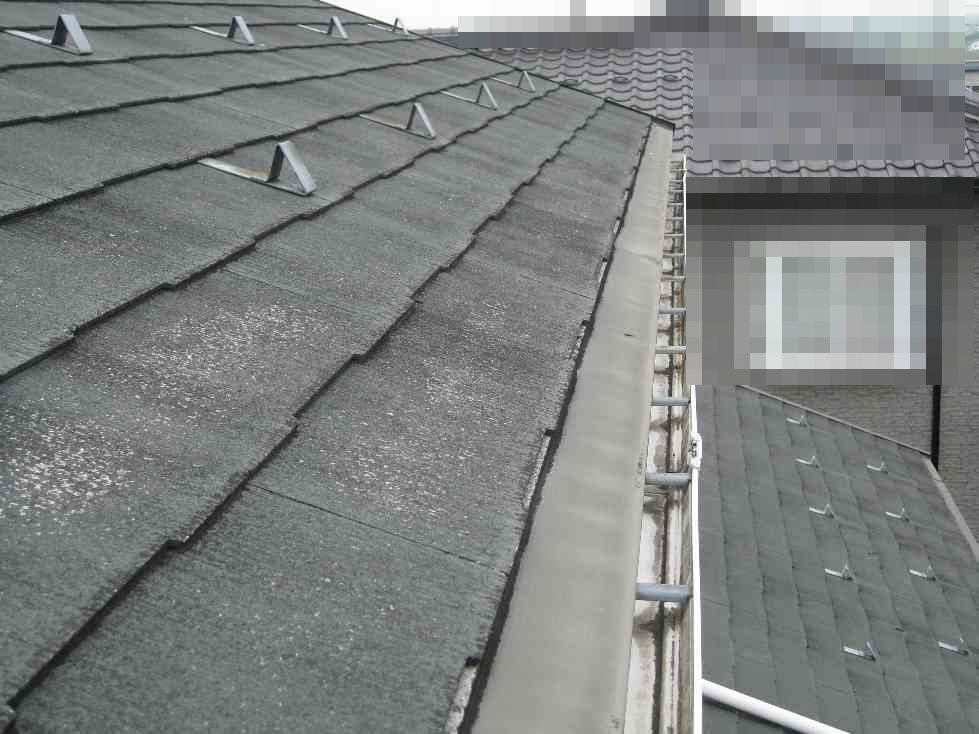 【屋根点検】2014年7月16日(水)お家の点検10年目(富山市八尾町A邸) 2015.03.06 屋根点検を実施。 屋根材はコロニアル仕様であり、セメントと人工繊維や天然繊維等を使用した無石綿の化粧スレート瓦に着色剤(防水塗膜)で覆われています。経年劣化等(紫外線や風雨、雪)による塗膜剥離等が見受けられました。 [大屋根] 大屋根から下屋への落雪の影響が大きいのか、下屋のコロニアルのヒビ割れ・破損が15~20箇所発見されました。後日、見積書を提示することをお約束。 [下屋] 屋根上で撮影した画像を見て頂いています。