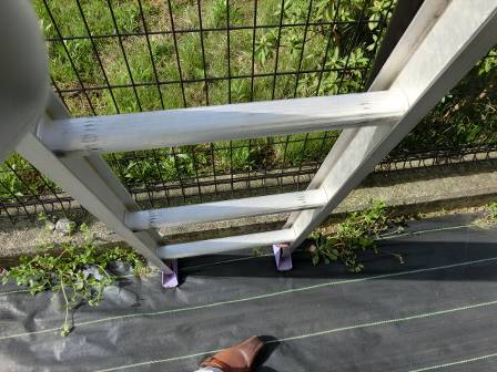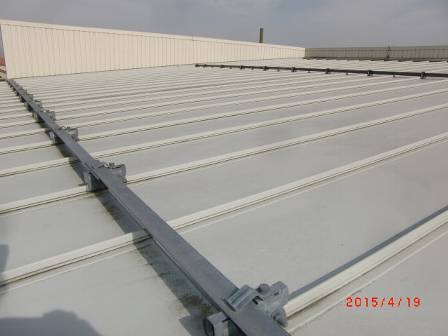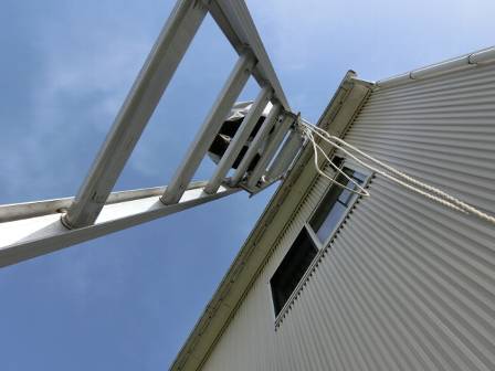 【屋根点検】2015年4月18日(土)お家の点検5年目(富山市婦中町T邸) 2016.02.18 時折の強風で長ハシゴが横倒しになりそうな天候でしたが、点検を強行実施。角度が急でしたが、支えを柵にすることで安定性を持たせました。ガルバリウム鋼鈑仕様の屋根です。特に異常はありません。 [建物左面/北側]