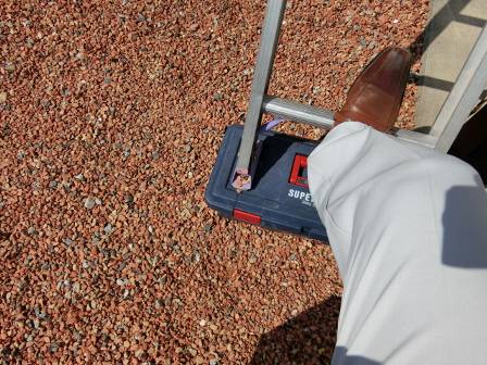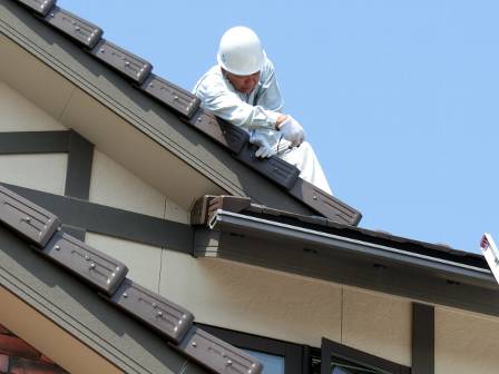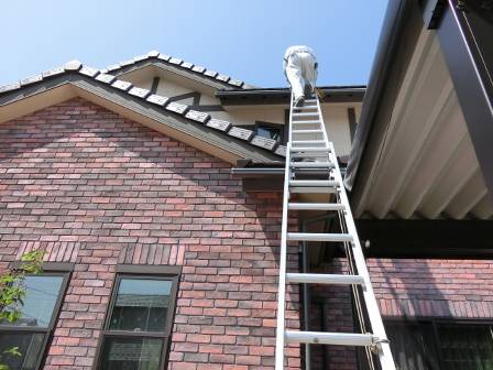 【屋根点検】2015年4月29日(水)お家の点検5年目(富山市S邸) 2016.02.18 屋根点検を実施。長バシゴの寸法が少し短かったので少し危ないかもしれませんが、足場に道具箱を敷いています。屋根の状態は特に異常はありません。 [建物前面/南側]