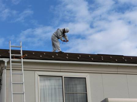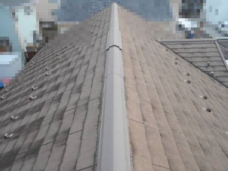【屋根点検】2016年10月18日(火)お家の点検10年目(富山市I邸) 2016.12.27 屋根点検を実施。 [建物前面/南側] コロニアルの1枚割れ(棟の横)や防水塗膜が剥がれ始めている状況をお客様へ説明。屋根や外壁の改修の必要性を理解して、将来的に検討して頂くようお願いしました。