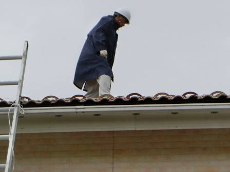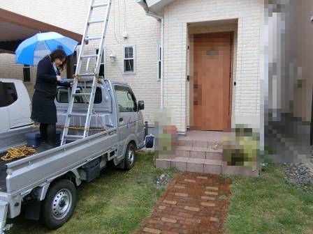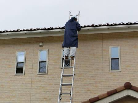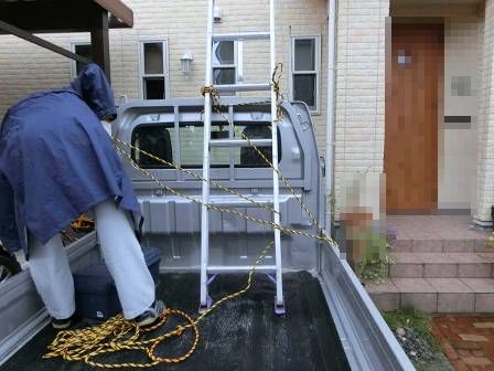 【屋根点検】2016年11月1日(火)お家の点検5年目(富山市婦中町N邸) 2017.03.04 屋根点検を実施。屋根材は洋瓦仕様です。特に異常はありません。 [建物前面/東側] 長ハシゴの足場を軽トラックの荷台にセッティングしています。なるべく人手がかからないような配慮が見受けられます。