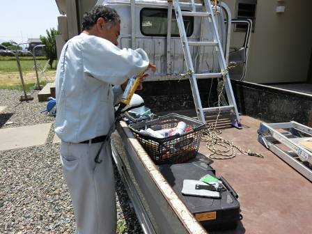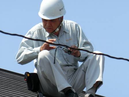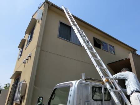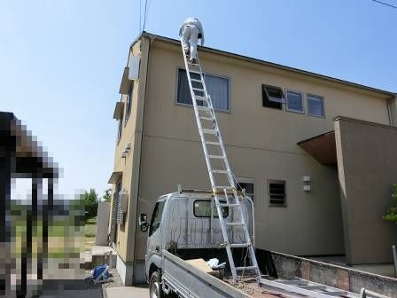 長ハシゴの長さが屋根まで届かないと判断し、トラックの荷台を足場代わりにしています。これだと長ハシゴの下で支える人手が不要になり、足場もシッカリしているので良いアイデアかもしれません。