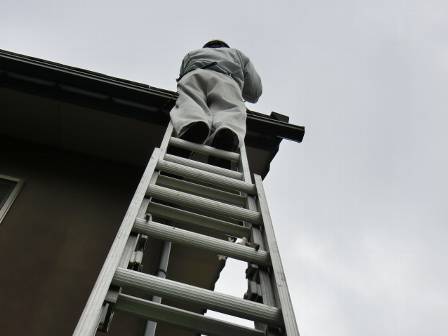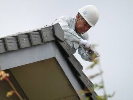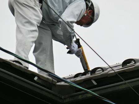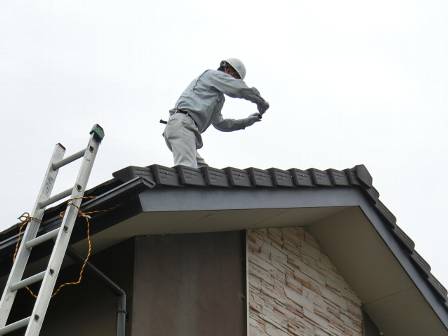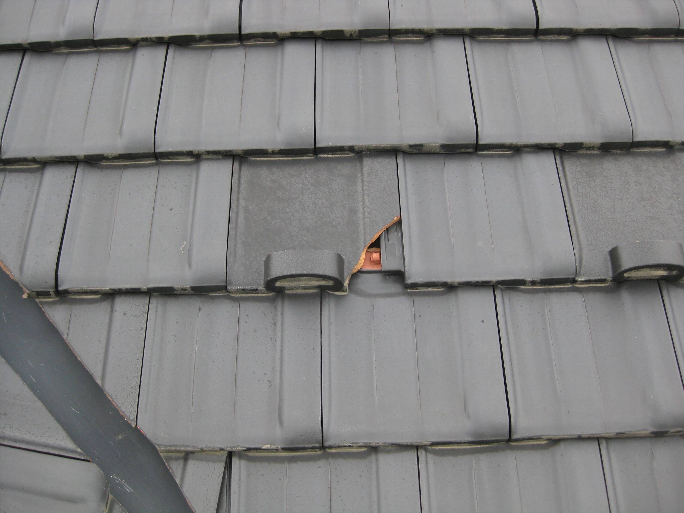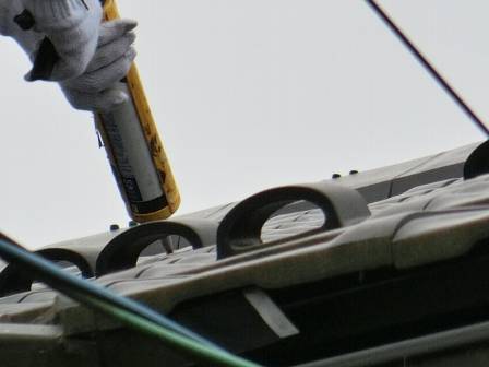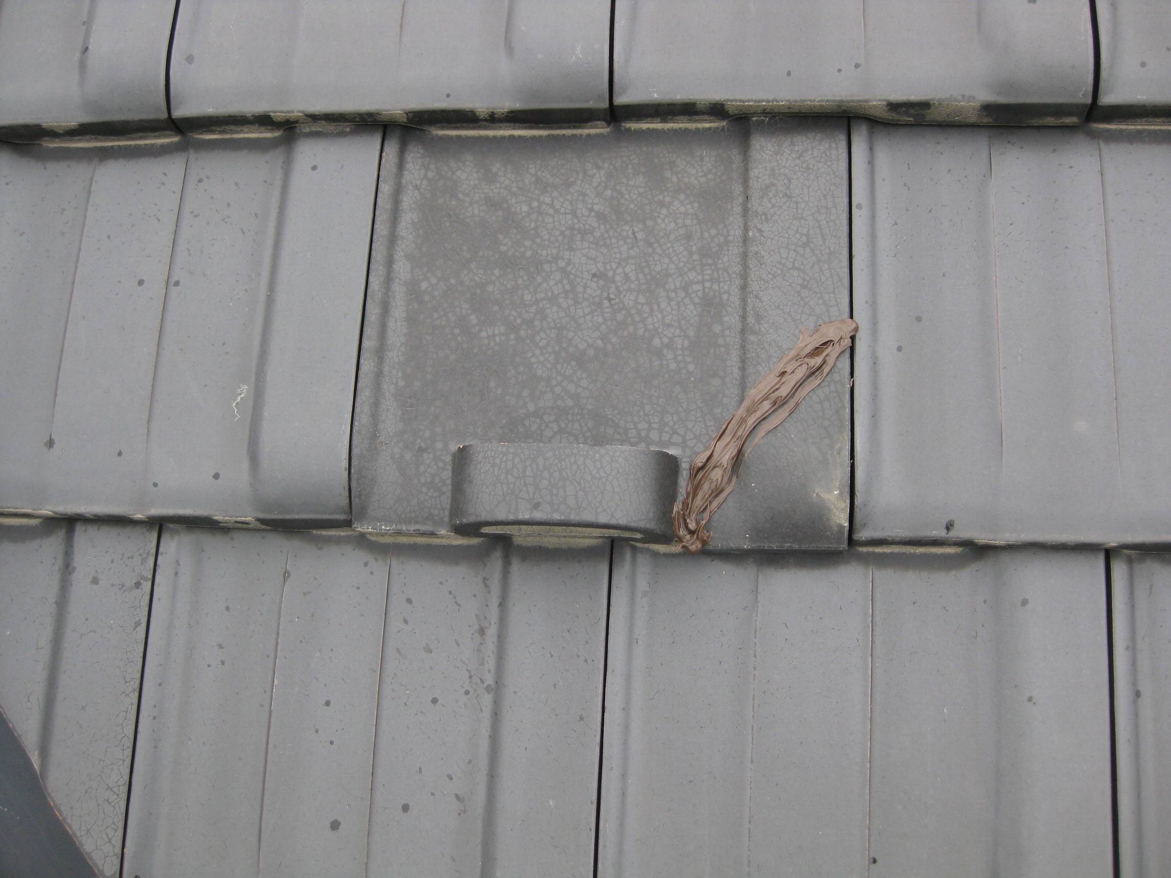 【屋根点検で瓦をシーリング補修】2015年6月19日(火)お家の点検10年目(富山市婦中町T邸) 2016.02.19 屋根点検を実施。 [建物左面/南側] 谷の部分で瓦の割れを1枚発見。シーリング剤を割れている箇所に充填して応急処置。 [補修前] [補修後]