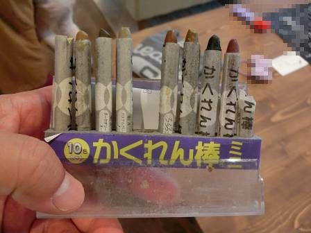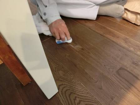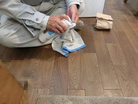 お客様に補修材の「かくれん棒」をお貸しして、傷口に塗り込んで頂くようお願いしました。クレヨン感覚で手軽にキズ補修できます。お客様の労力の甲斐あってか少しは目立たなくなりました。このように補修材を上手に使うことで目立たなくなる事例を体験して頂きました。