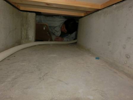 特に異常はありません。間取り・床下の状態によっては方向転換が難しいこともあるそうで、これは後ろ向きに進んでいる様子。這って前進・後退して配管を傷つけないよう細心の注意を払っています。