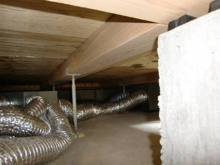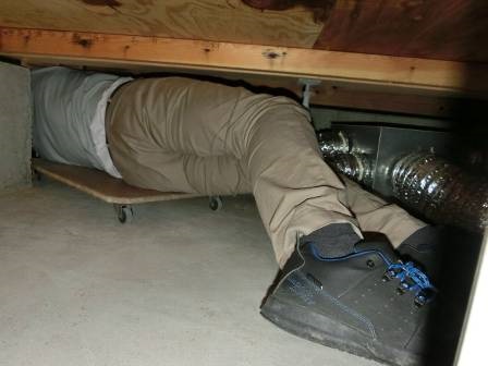 床下点検を実施。エコアイ換気用の床下仕様・構造になっています。お客様は興味津々で床下の様子を見ておられました。
