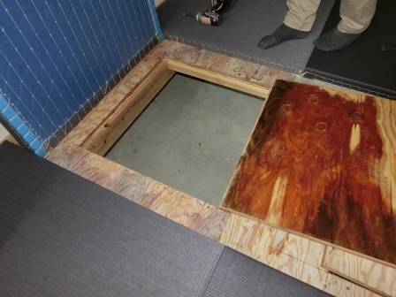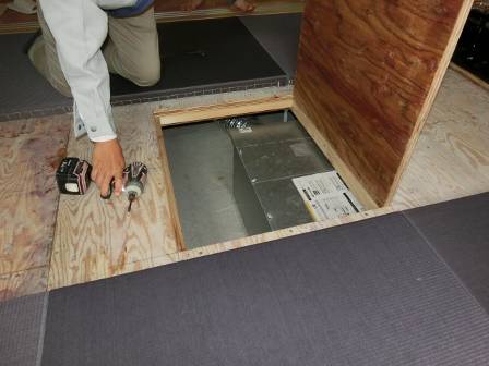 床下点検を実施。真ん中はエコアイ換気機械の点検口となっているので、その横が床下に進入できる点検口です。