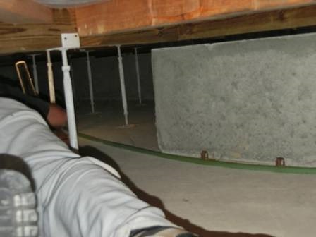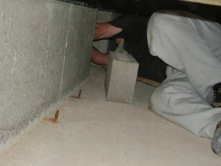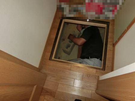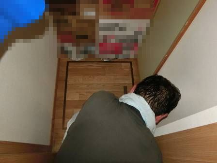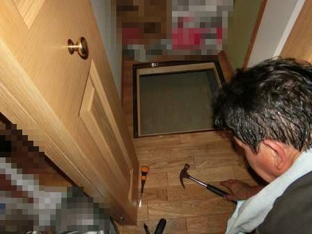 【床下点検/水漏れ発見】2014年8月6日(水)お家の点検10年目(富山市S邸) 2015.03.07 床下点検をすべく点検口の蓋を取ろうとしましたが、周囲の無垢の床材が湿度等の影響で膨張しているせいか、ドライバーやハンマーでこじ開けようにも開きません。開かないからと言って床下点検をしない訳にもいかないので、枠材に多少のキズが残ることを事前に了承を頂き、やっとのことで開きました。 食洗機からの排水管が何らかの拍子にずれてしまったのか、排水が床下に漏れているのを発見。 応急処置として排水管をテーピングして下から配管を支える為のブロックを床下に持ち込みました。今回は応急処置ではありましたが、対処した跡の状態をデジカメ画像でお客様に説明しました。