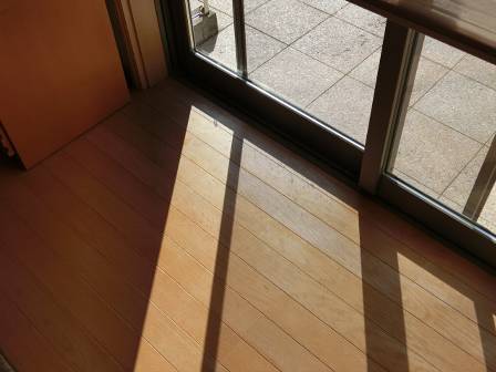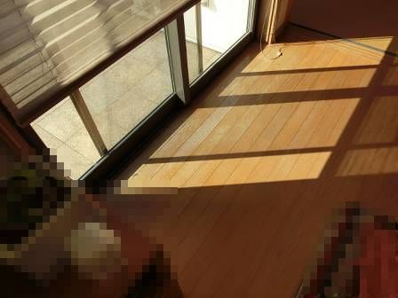 【床材の変色】2014年11月11日(火)お家の点検10年目(富山市M邸) 2015.07.31 太陽の陽射し・紫外線の影響によって、窓際から数列の床材が変色していました。遮光などの対策によってはある程度防げる現象かもしれません。 [LDK/南側]