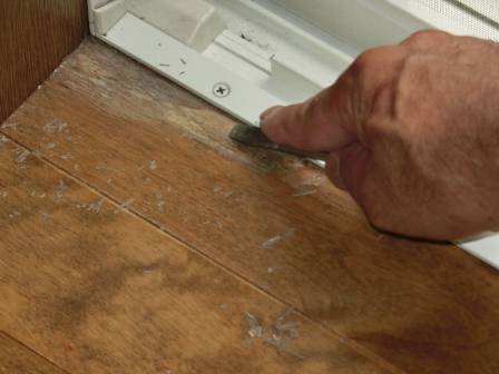現状を確認。この症状は腐蝕とまではいきませんが、床材の皮膜が変色したものと思われます。マイナスドライバーで表面の皮膜を取り除いて、この削り跡にニス等を塗って頂くことで見た目は改善されると思われます。