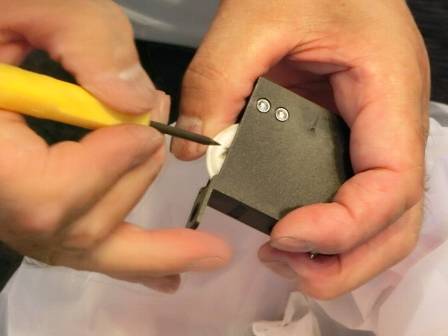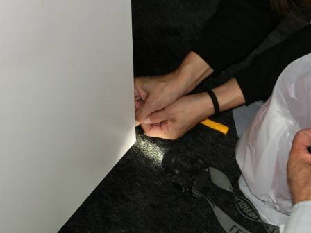 お客様からキリなどをお借りしながら車輪の掃除を実施。その後に引き戸を元に戻して開閉検査をしましたが、改善されません。後日、メーカー同行で対処することになりました。