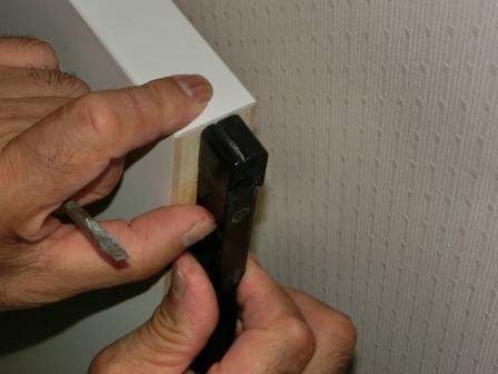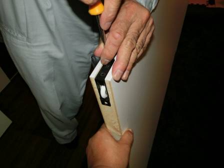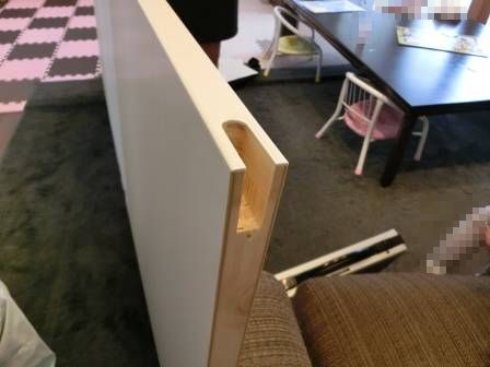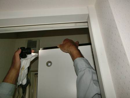 A 現状を確認。引き戸が完全に閉まらない状態でした。引き戸の上部にあるソフトクローズの部材の動きに摩擦があるように感じられたので、いったん引き戸を取り外して部位を確認。