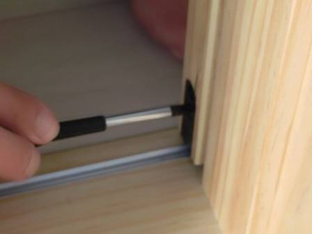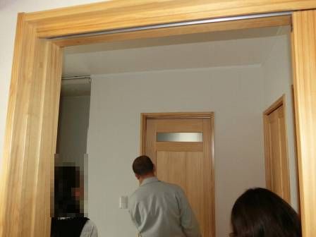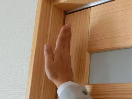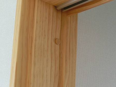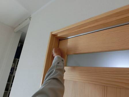 【引き戸の傾き】2016年11月11日(金)お家の点検2年目(富山市K邸) 2017.03.04 Q 引き戸が傾いている。傾きの直し方を知りたい(事前葉書) 現状を確認。この扉は無垢仕様となっているので、枠には丸いクッション材(木部の保護・キズ防止)が取り付けられています。完全に閉め切った状態でも少し傾いて見える(扉と枠の間から光が差し込む)のですが、今回は傾きが大きかったので、経年変化等によって木部が伸縮したものと思われます。 [1階トイレ] 扉の左右の側面にある傾きや高さを調整できるネジの場所をお客様へ指し示しながら補正。お客様に扉の仕組みを理解して頂きました。
