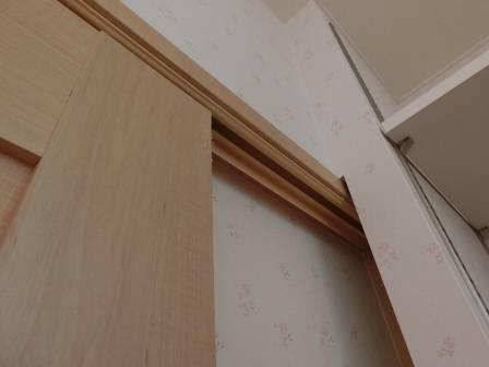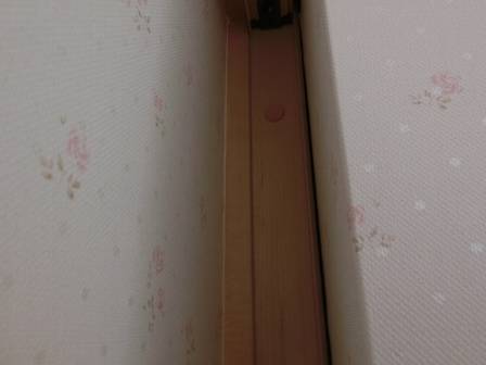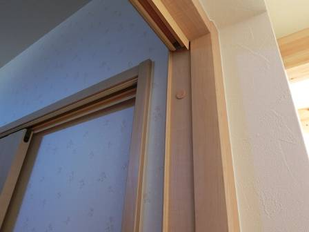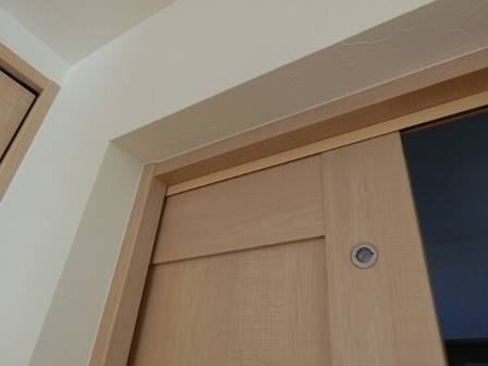 【引き戸の開閉音】2013年11月30日(土)お家の点検1年目(高岡市S邸) 2014.02.27 Q 引き戸を開ける時の緩衝材はあるのか?閉める時はソフトクローザー機能でゆっくりブレーキがかかって静かであるが、子供が思い切って開ける時にウルサイことがある。 [洗面脱衣室] 現状を確認。戸袋に扉が収まる(引き戸を開ける)時に扉と枠がぶつかる音ですが、基本仕様としての緩衝材は貼ってあるのですが、追加で貼ることをお願いしました。 そこで手持ちの緩衝材(クリアバンパー/通称、涙目)を少し差し上げました。これを枠や扉の面に余分に取り付けることで衝撃音が少しでも緩和されると思われます。