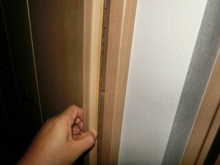 【戸当たりのはずれ】2016年11月1日(火)お家の点検5年目(富山市婦中町N邸) 2017.03.04 Q この場所の戸当たりだけがよくはずれる。 A 現状を確認。ドア枠の施工は戸当たりを叩いて押し込んで納めています。実際に戸当たりを取り外して「戸当たりの下地にドア枠を固定しているビス」があることを紹介。戸当たりが外れないようにボンド固定しても良いのですが、ドア枠材を調整する大掛かりな工事が発生した場合は戸当たりを外す事例もあるので、手で叩いて納めて頂くようお願いしました。 [1階廊下とホールの仕切り]