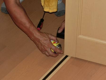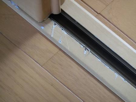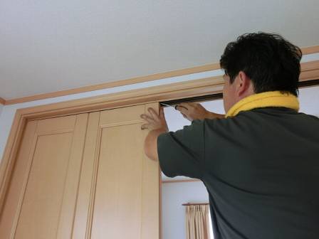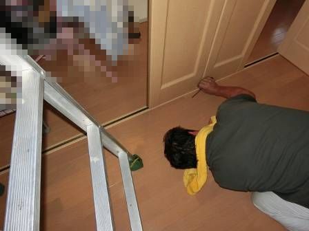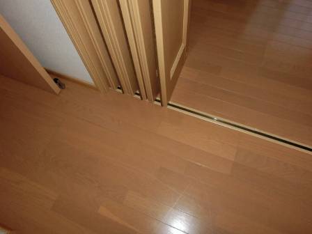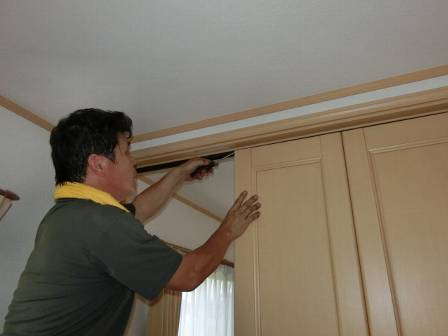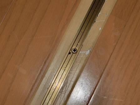 【折れ戸の開閉時の引っ掛かり】2014年8月11日(月)お家の点検10年目(富山市Y邸) 2015.03.07 折れ戸の開閉検査。横に移動する時にレール部分に引っ掛かりを発見。 [2階居室] 扉の上部にあるビスを左右からドライバーで補正。左右の動きは改善されましたが、扉を折り曲げた時に底部が床を擦っている状態でした。 [左側] [右側] 改めて検査すると、レールが扉の開閉の際に削れている状態だったので、再度上部のビスを調整。 最後に潤滑油(CRC)をレールとピボットの間(摩擦のある部分)に吹きつけ、レール内のビスも増し締めして現状を改善。