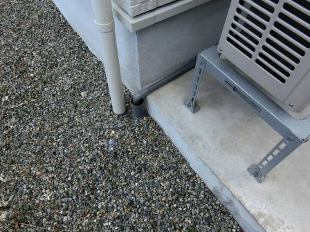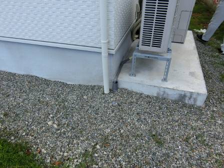 室外機のドレンホースからの排水(熱交換によって発生)を流す経路。この排水経路が整備されていると、設備台の表面に溜まった排水等でコケが生えたりしないので、比較的長い間きれいな状態を保つことができると思われます。