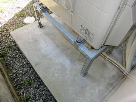 【排水経路の工夫】2014年10月25日(土)お家の点検1年目(富山市W邸) 2015.06.02 設備台の土間コンクリートが汚れてしまうのを防ぐ配慮。室外機や給湯器等のダクトホースから結露水等の排水を逃がす・流せるように設備台に穴を開ける施工が一般的です。 [建物後面/南側]