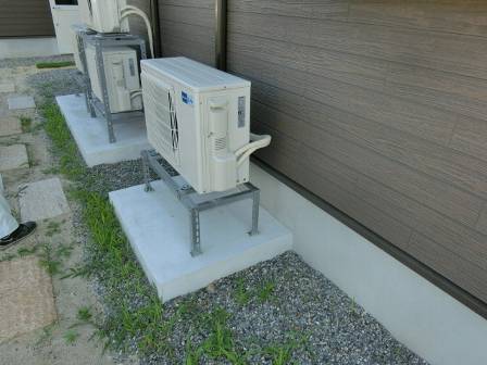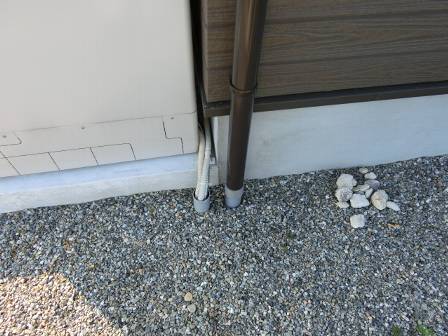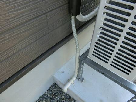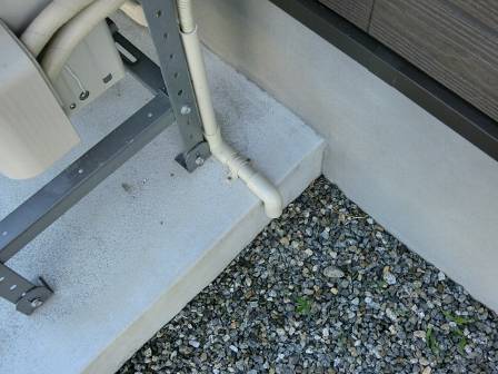 【排水経路の工夫】2014年6月24日(火)お家の点検1年目(富山市婦中町M邸) 2015.03.06 設備台の土間コンクリート表面に藻やカビ等で汚れないように、ダクトホースからの排水先について配慮されています。室外機の配置によってホースが色んな工夫で配されています。 [建物左面/東側/室外機] 室外機からの排水を逃がす施工。1年経過した今も施工当時のコンクリート肌の美しさを保っています。