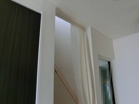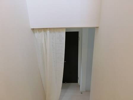 階段口には突っ張り棒をカーテンレール代わりにされていました。冬の間、2階からの寒気の流入を防ぐこと、玄関から内側が見えないようにするプライバシーの保護の役割があります。