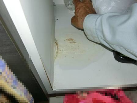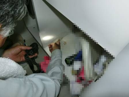 【水漏れ検査】2016年5月13日(金)お家の点検5年目(富山市I邸) 2016.12.27 給排水管からの水漏れの有無を検査。水漏れの形跡はありませんでした。 [洗面脱衣室] [キッチン] 水漏れ検査の際に何かがこぼれた跡を発見。水漏れかと思われたのですが、お客様にお聞きしたところ、誤ってハイターをこぼしたようでした。 [洗面化粧台] こぼした当時に拭き残しがあったのか、合板の素材にも関係しているのですが、表面がボロボロになっていました。