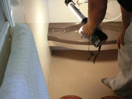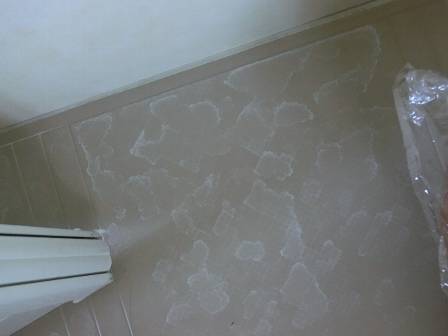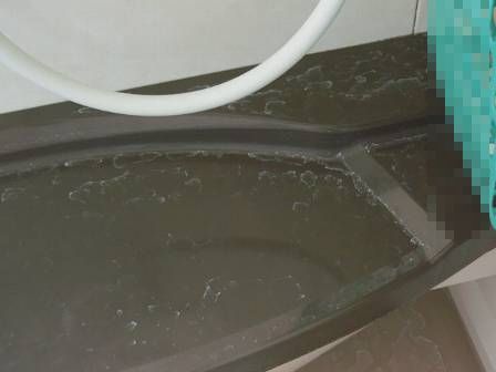 現状を確認。カルキ(塩化石灰)と思われる白い汚れがかなり目立っていました。最初の頃はタワシで擦っておられたようですが、UBの床材が削れてしまう心配もあってか、その後は根気よくタオルやスポンジ等の表面が柔らかいもので擦っておられるご様子。