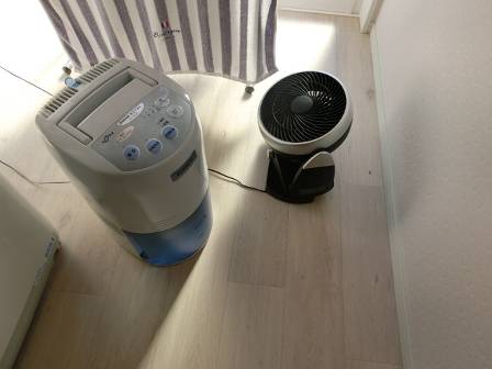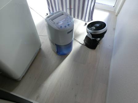 今回の事例のようにサーキュレーターを使って室内・家内の空気を循環・撹拌(かくはん)させると、乾いた空気と湿った空気が混ざることで、湿度が低下(除湿に似た現象で湿度が下がる)して洗濯物は日陰であっても寒くても少しずつ乾かせると思われます。