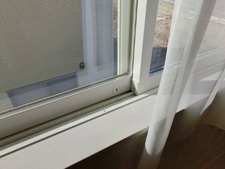 寝室のサッシ枠にも結露が少し発生していました。これも一般的な現象であり、ご家庭の寝室では冬の間は室温の低下と就寝時の呼吸による室内の水蒸気量の増加によって露点・結露化する事例があります。また、厚手のカーテン内外では室温差がある(室内が暖かくてもカーテンとサッシの間の気温が低い)ことも結露化の一因となっています。
