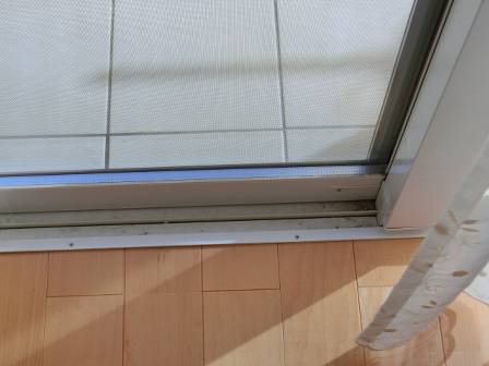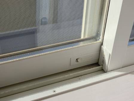 LDKは床暖房を点いているので暖かく、天候の悪い日は室内干しをされているご様子。どのご家庭でも冬場の室内干しは一般的な光景だと思われます。サッシ枠を見ると、ゴム枠部分には結露跡の汚れや小さなカビが発生していました。