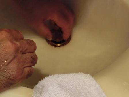 何回か洗面台の引き棒を引っ張って・引き戻ししてポップアップ排水金具(ドレンユニット)を操作しながら排水状態を再確認。アップ高が少し低いせいか排水量が少なくなっているようで、指先で摘まんで少し上に持ち上げると勢いよく排水されました。原因は引き棒との接続だと思われますので、後日、輸入部材の専門業者に相談することをお約束。