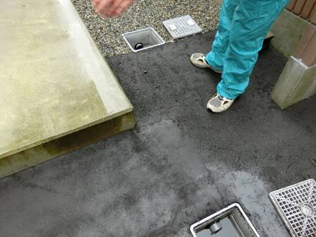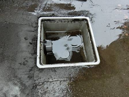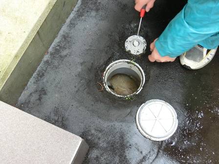 雨水枡の点検を実施。この雨水枡のある場所は周囲よりも少し凹んでおり、雨水が貯まりやすい場所となっています。そこで、メッシュ状の蓋にして雨水を枡内に貯めるようにして排出させています。