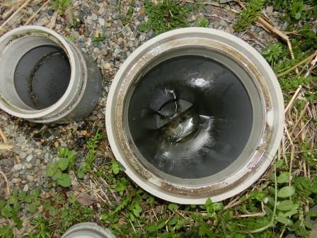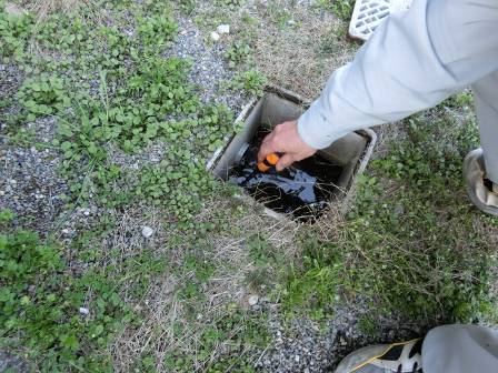 試しにドライバーを枡内に入れて泥の溜まり具合・深さを測定・検査すると、かなりの量の泥が溜まっていました。このまま放置しておくと、雨樋などの配管を詰まらせてしまう可能性もあるので、ショベル等で泥を枡外に排出して頂くようお願いしました。