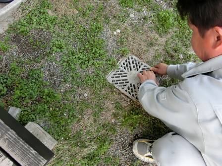 雨水枡の点検を実施。蓋は周囲・外構に溜まる雨水も排水できるメッシュ型になっています。