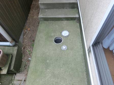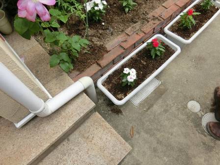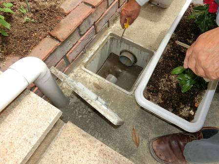 雨水枡の点検を実施。雨水枡はプランターの下にありました。蓋を開けて泥の溜まり具合を確認。特に異常はありませんでした。