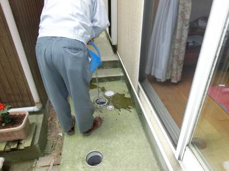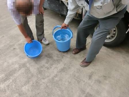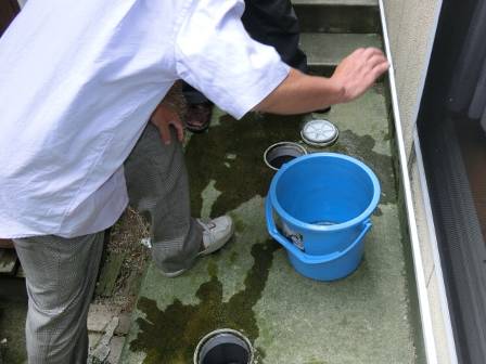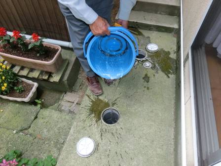 ホースが汚水枡のある場所まで届かなかったので、お客様にバケツに水を入れて頂いてバケツから流れ落ちる水の勢いで洗浄しています。溜まっていた油脂等がキレイに流れました。
